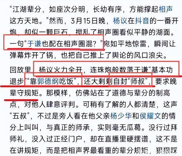 除了他与侯耀华的“拜师乌龙”,与郭德纲的“清门乌龙”外,竟然还和于谦有一段“造谣乌龙”。 在直播间里,杨议曾直接说: “于谦也配在相声界混”?